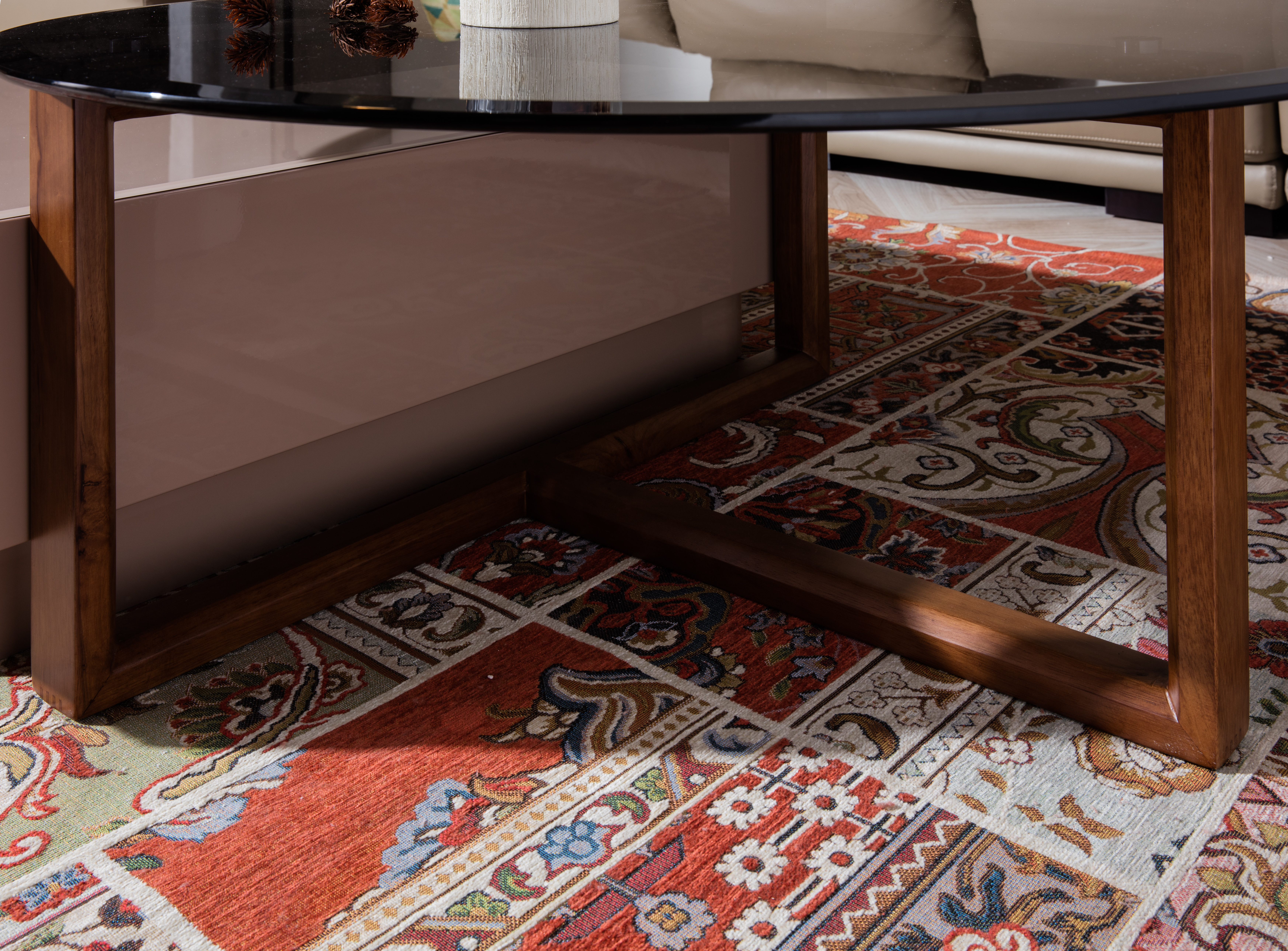圆几,胡桃木色,钢化玻璃+密度板+橡胶木